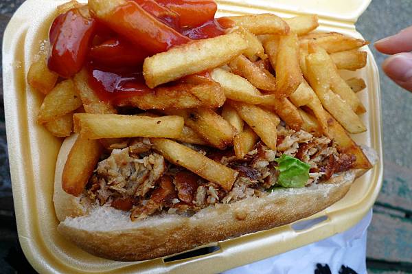 出外走走總要吃吃它們的路邊攤看看、麵包裹著像沙威瑪的肉片加上一份薯條!寒冬中特顯美味,但怎麼用這個看起來就很毒的保麗龍餐盒呢?